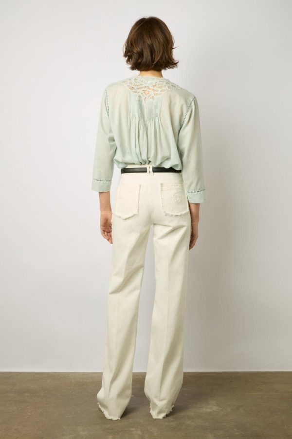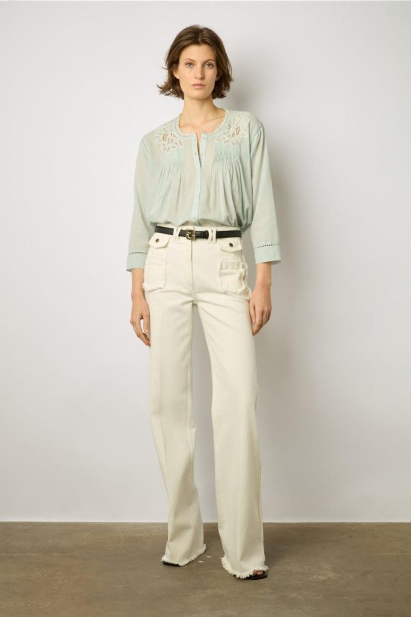 - Emmanchure, bas des manches et bas de la chemise ornés d’une frise ajourée