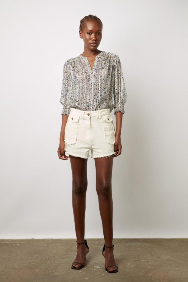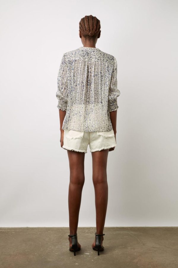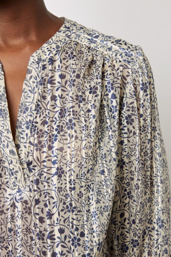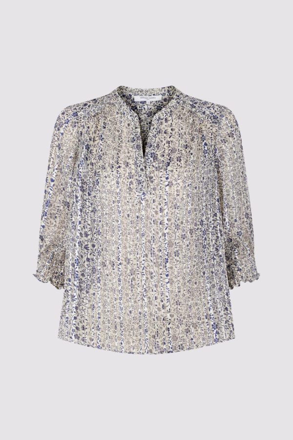 Blouse en mousseline rayée avec un fil de lurex et imprimé floral bicolore.