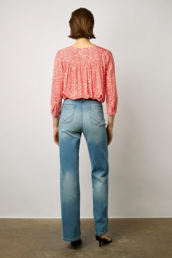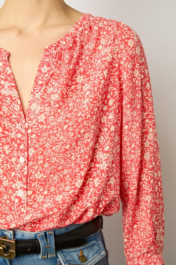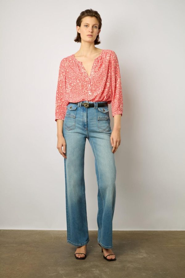 Blouse fluide à petites fleurs bicolores dans une matière au toucher soie.