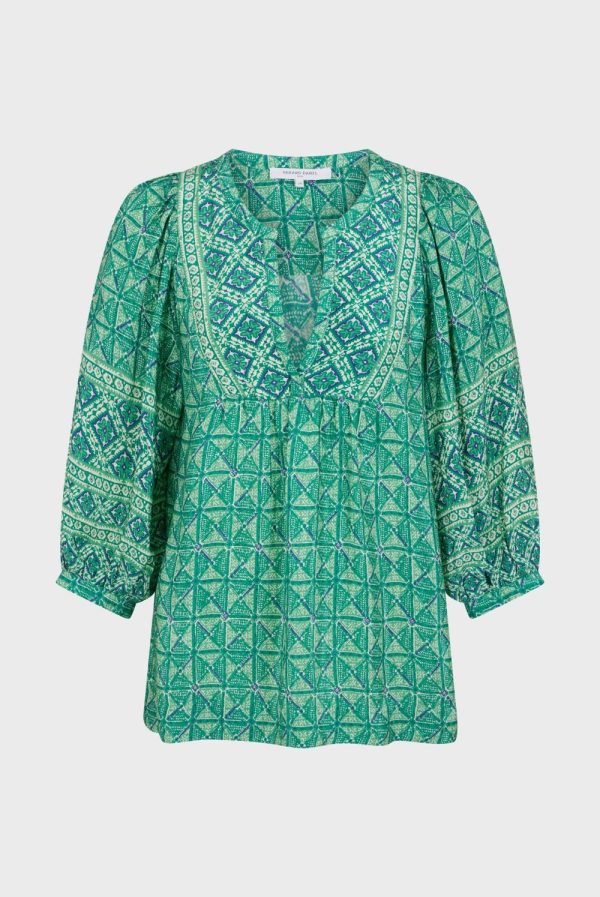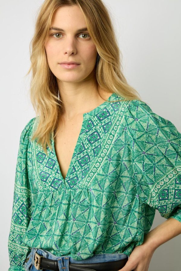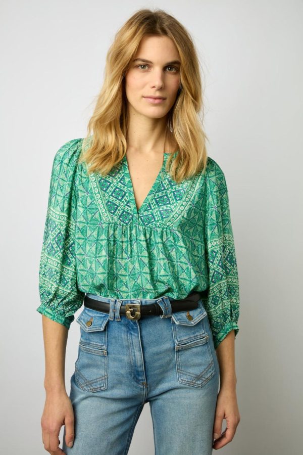 Blouse dans une matière douce et fluide au toucher soie. Imprimé foulard bicolore.