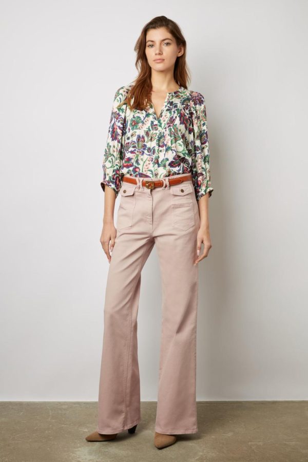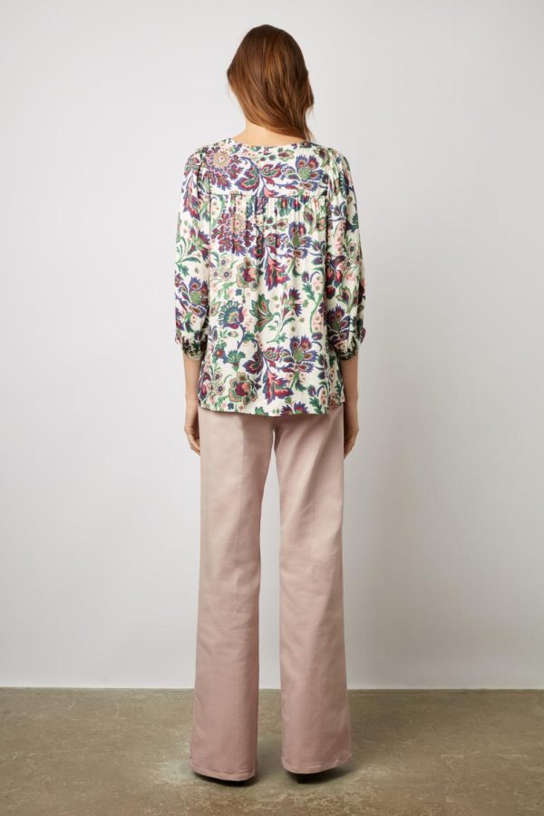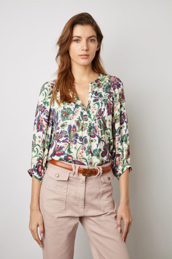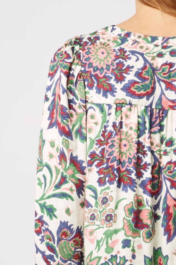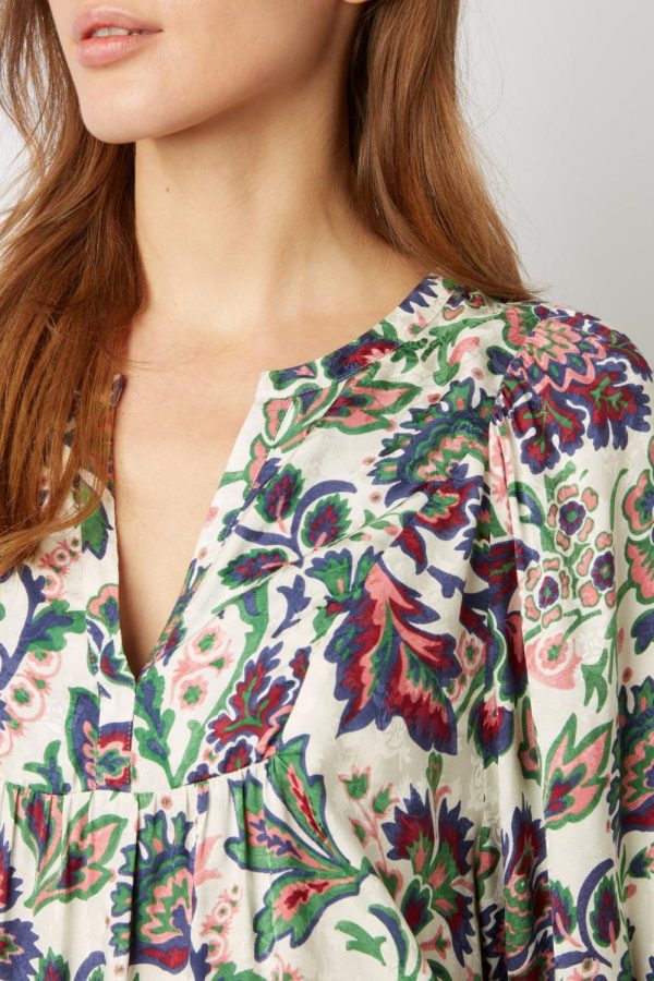 Blouse dans une matière douce et fluide au toucher soie. Imprimé fleurs contrastées sur fond jacquard.