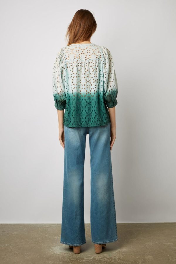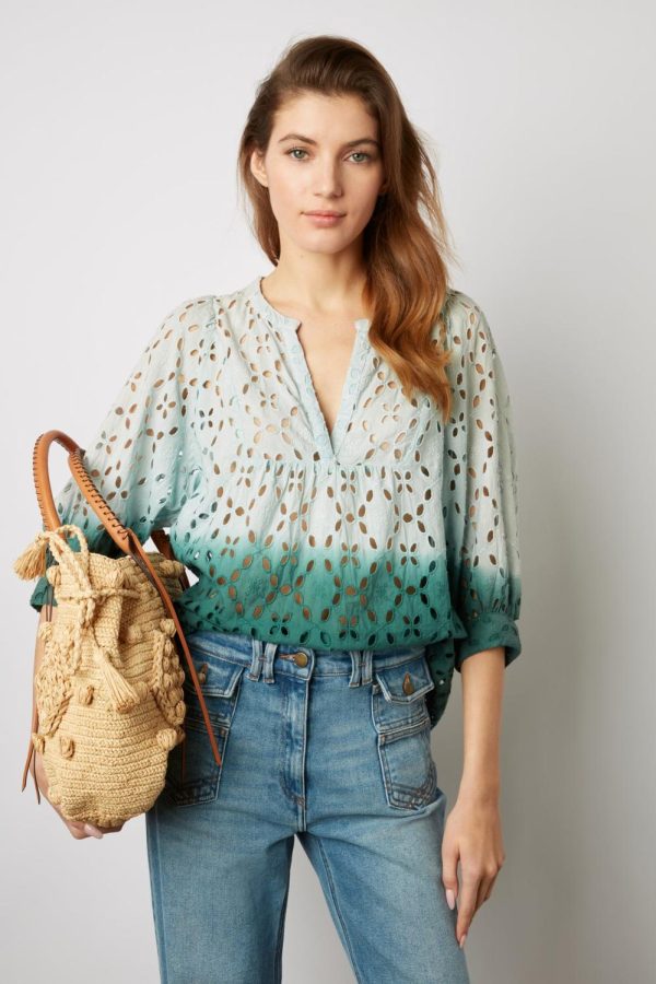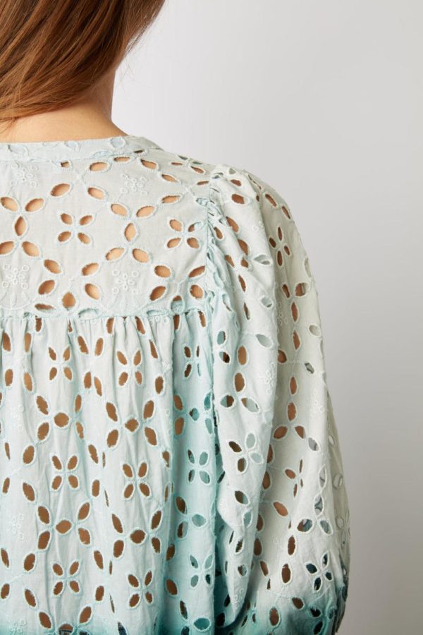 Blouse tie and dye avec des motifs de fleurs ajourés brodés. 100% coton.