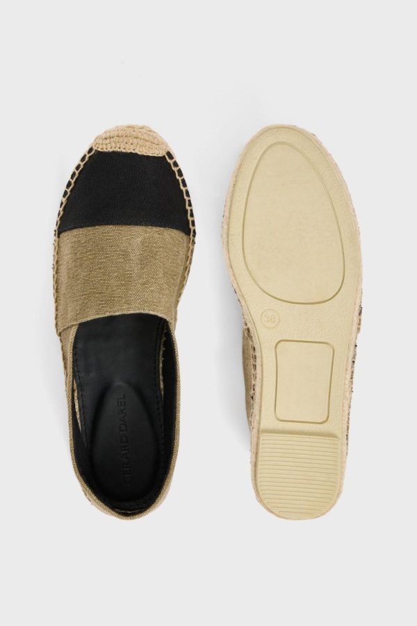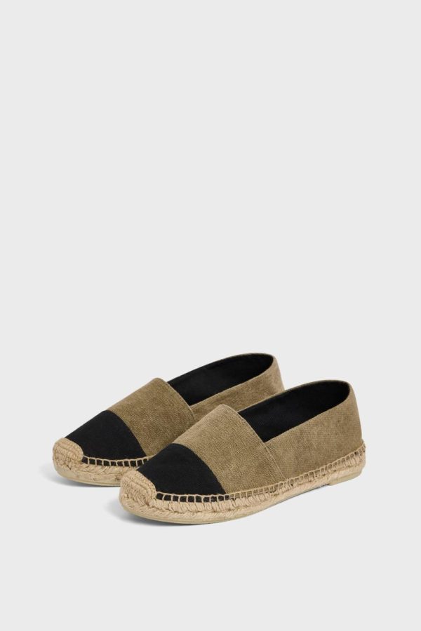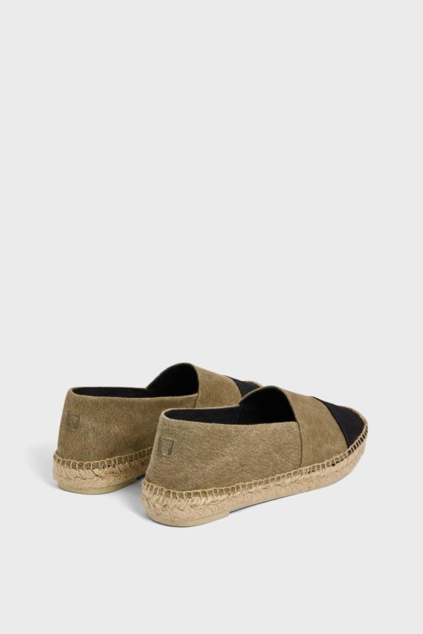 Espadrilles en toile bicolore montées sur une semelle de caoutchouc et corde. Bout rond renforcé.