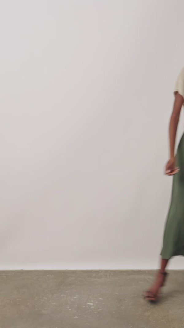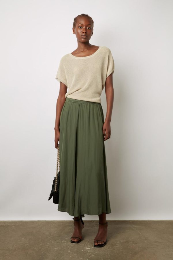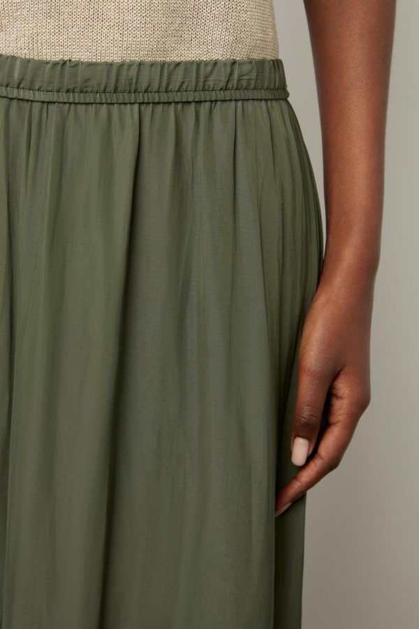 Jupe longue satinée plissée dans un kaki tendance, à marier avec des coloris clairs ou foncés.Matière souple au toucher soie.