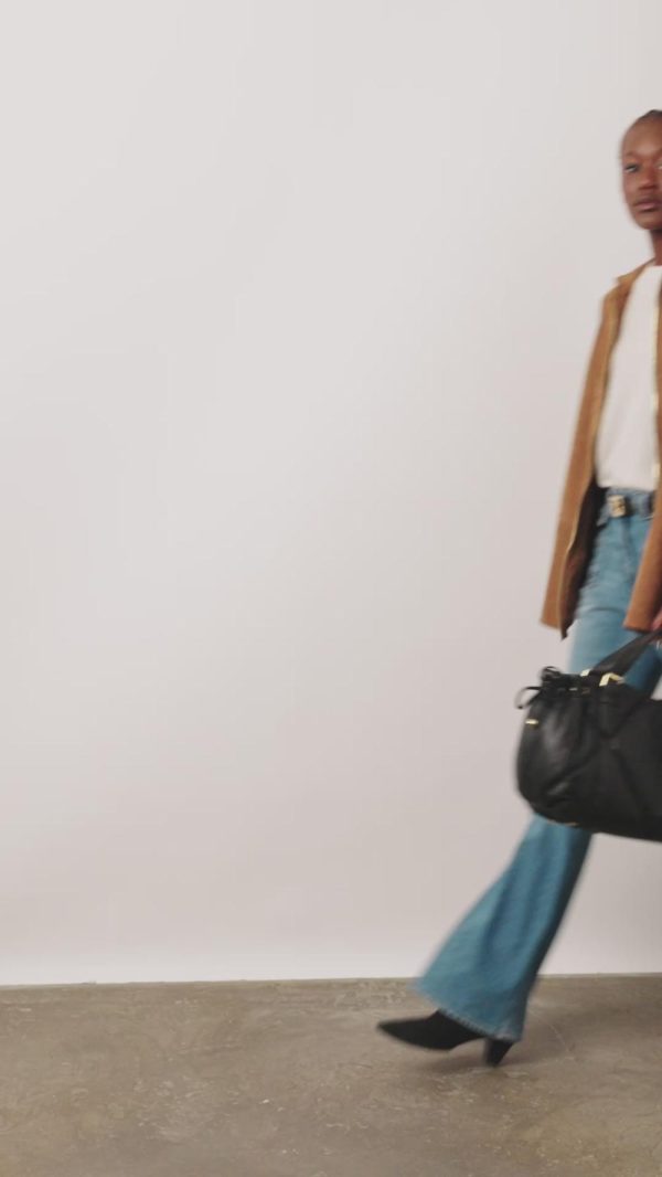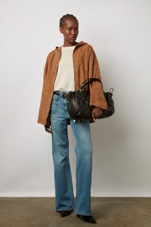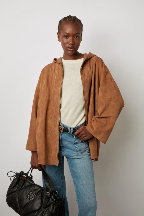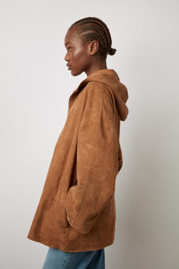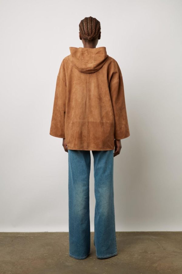 Manteau de mi-saison à capuche en cuir velours très souple. Chic et décontracté.
