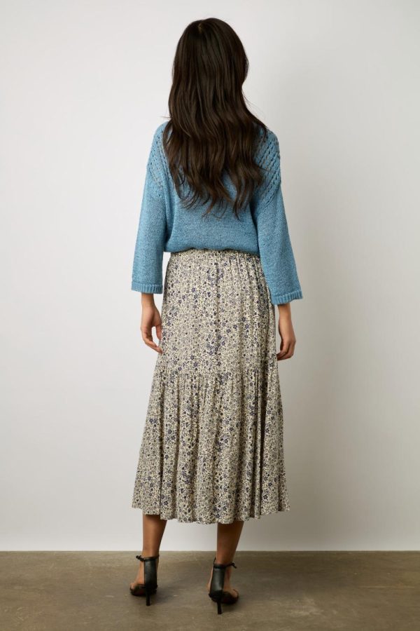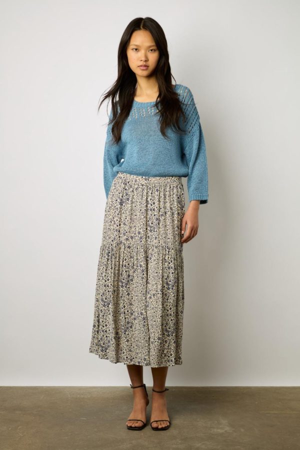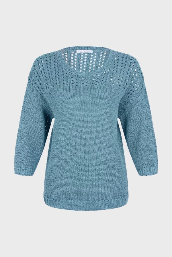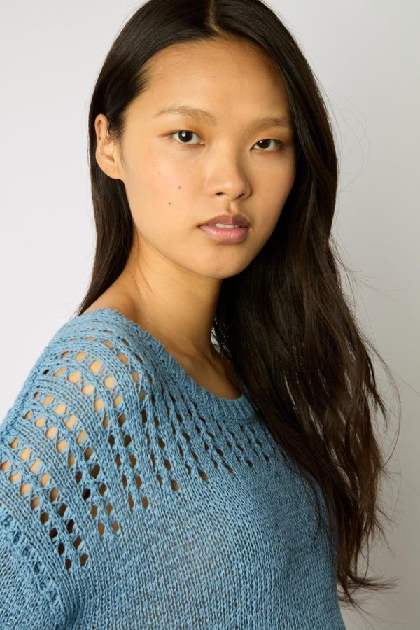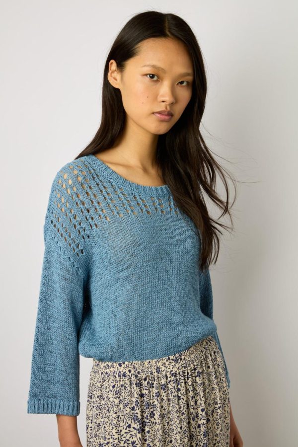 Pull col rond dans un bleu à marier avec différents tons de couleurs, des plus clairs aux plus foncés. Maille ajourée dans un esprit printanier.