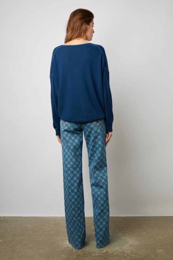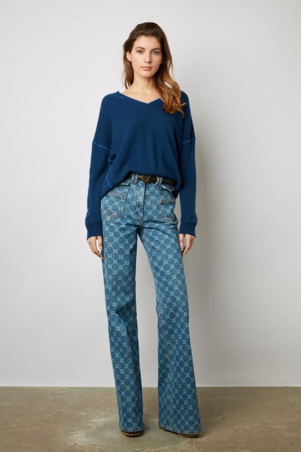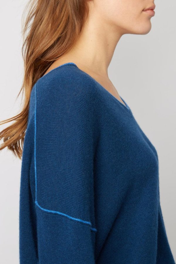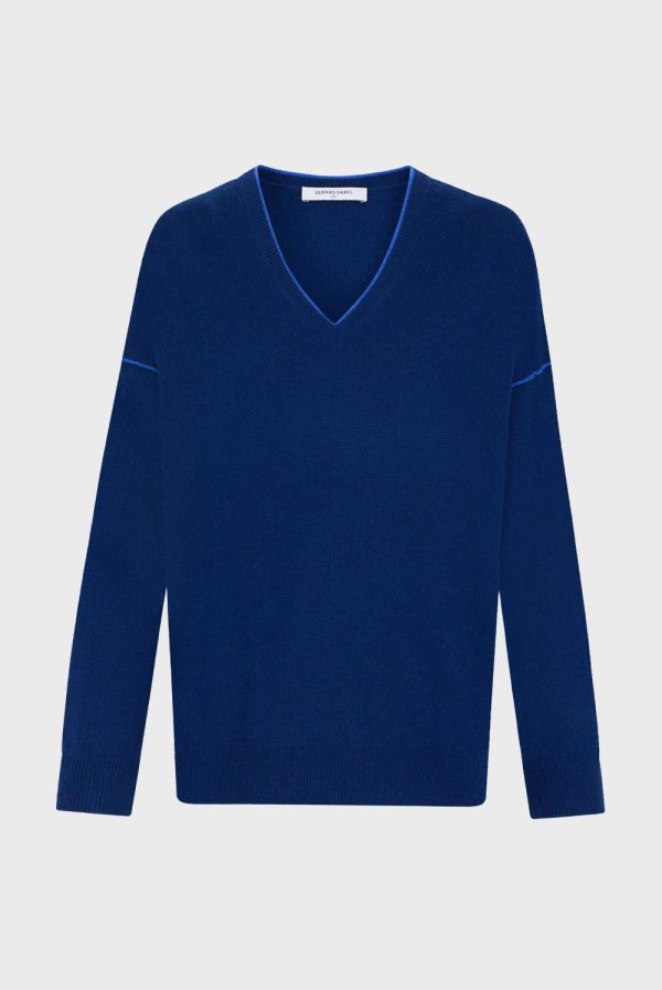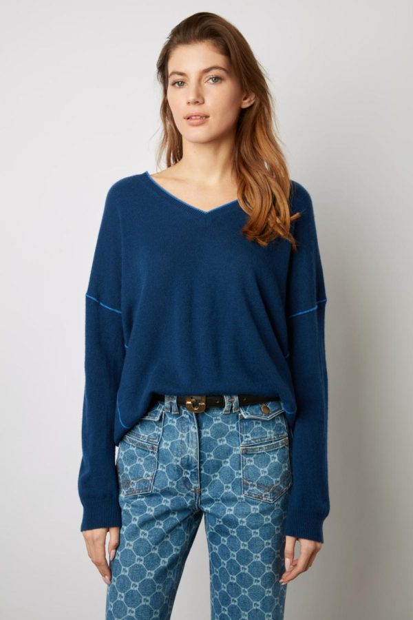 Pull V en 100% cachemire uni aux coutures colorées pour un twist fantaisie.