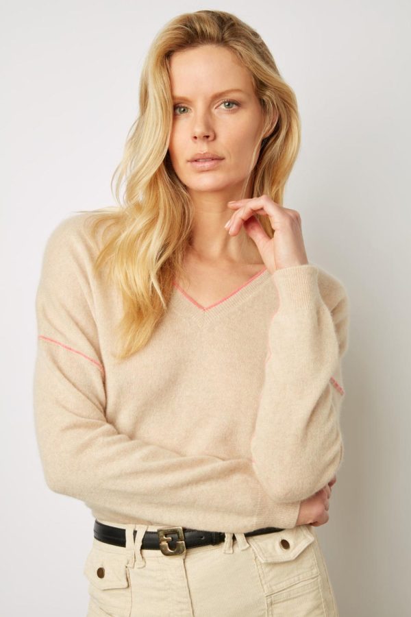 Pull V en 100% cachemire uni aux coutures colorées pour un twist fantaisie.