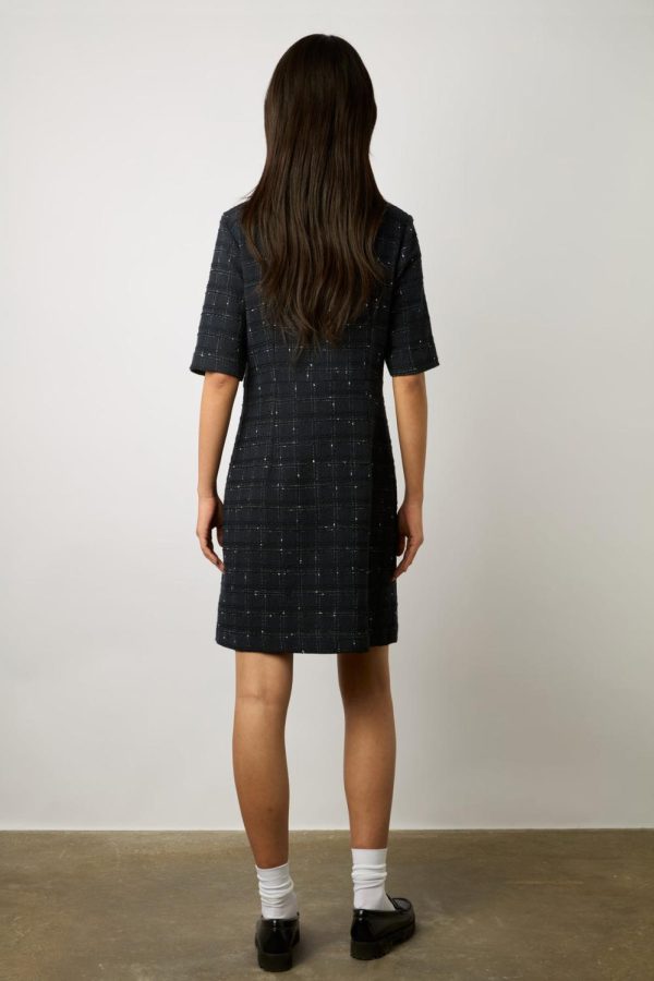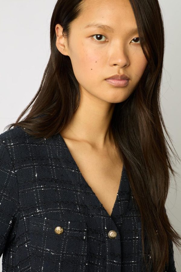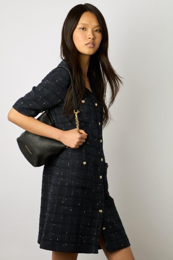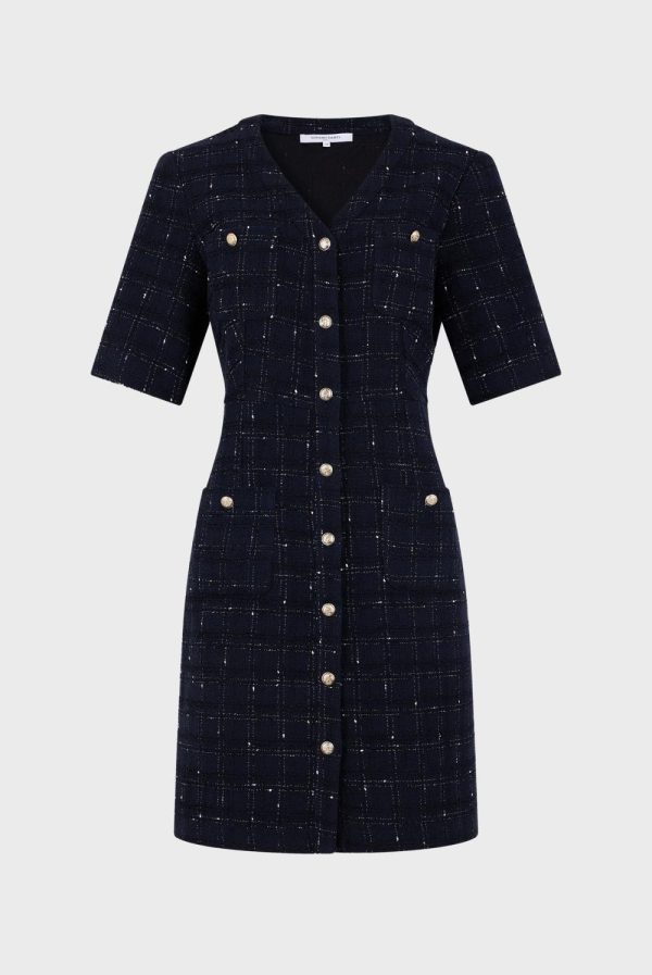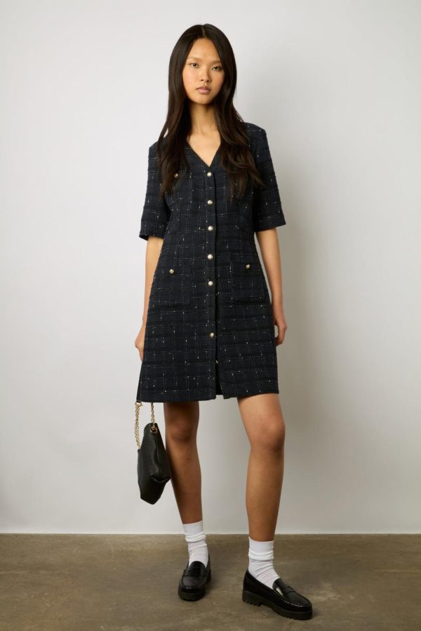 Robe courte et cintrée en tweed avec des boutons dorés. Elégance classique et intemporelle.