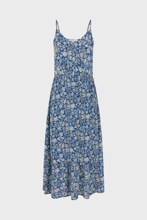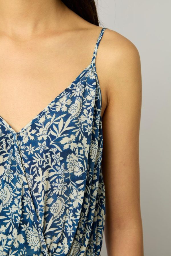 Robe à fines bretelles dans une matière au toucher soie. Imprimé tropical bicolore.