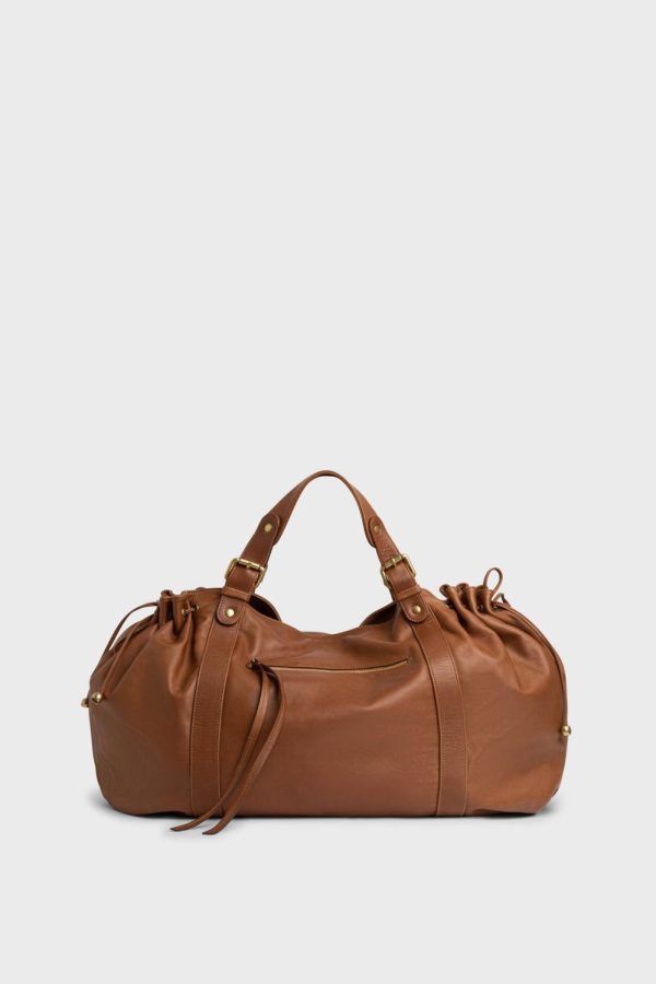 - Sac froncé sur les côtés par deux liens en cuir, enveloppé de bandes de corps