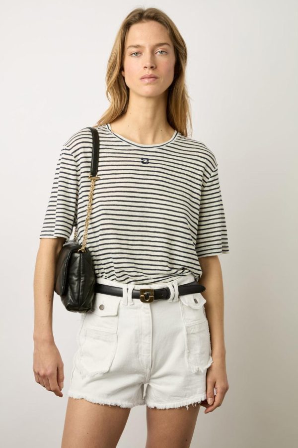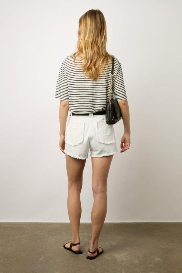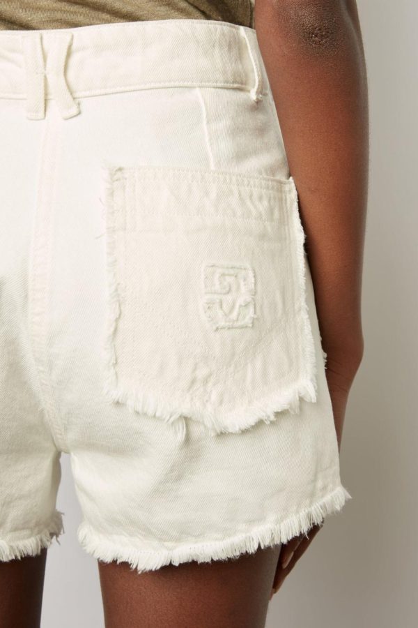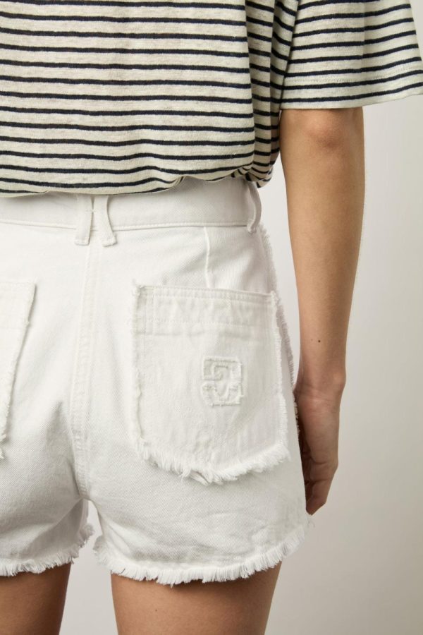 Version short du jean ANNA, pièce iconique de la maison Darel. Denim écru et finitions frangées dans un esprit rock.