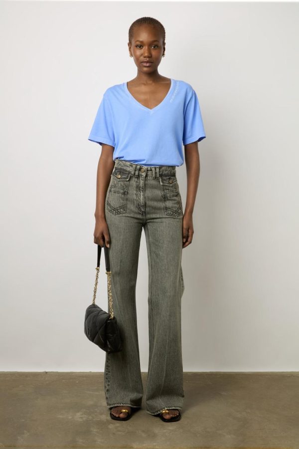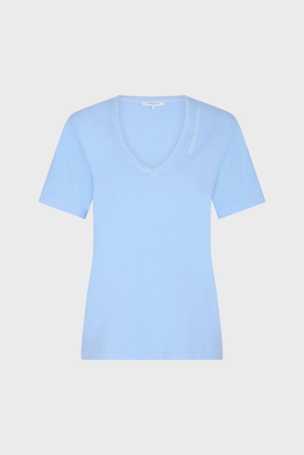 T-shirt col V « cool dye » : effet blanchi qui donne à la matière un aspect lumineux. Message brodé sous le col. 100% coton.