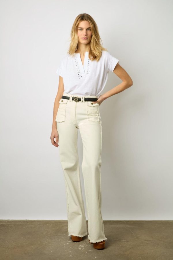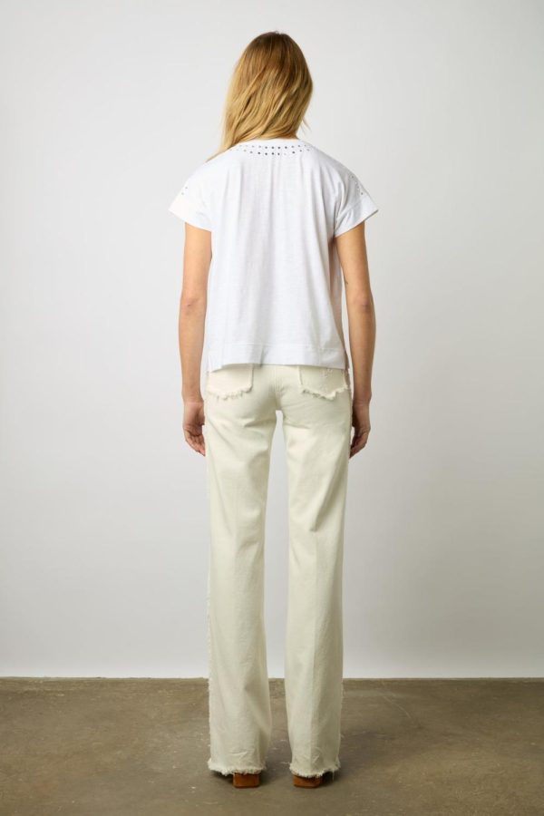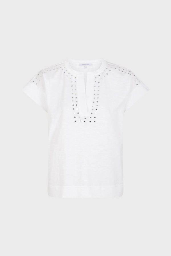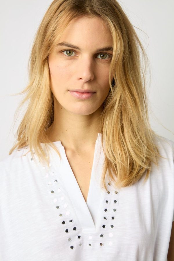 T-shirt à l’encolure et aux épaules ornées de pastilles effet miroir. 100% coton.