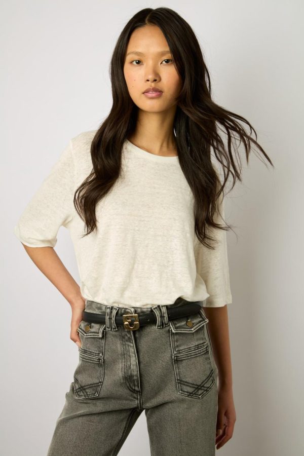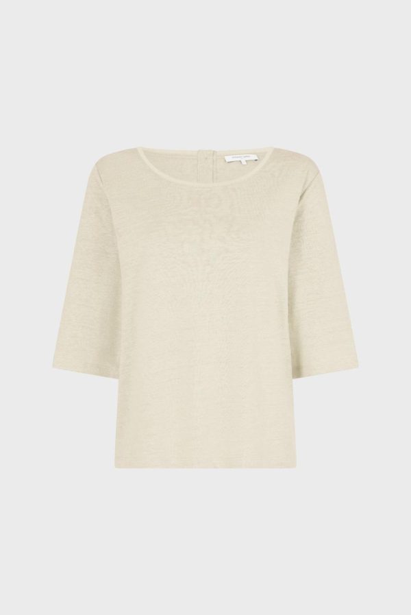 T-shirt boutonné dans le dos en 100% lin. Coloris écru à porter avec des teintes pastel ou foncées.