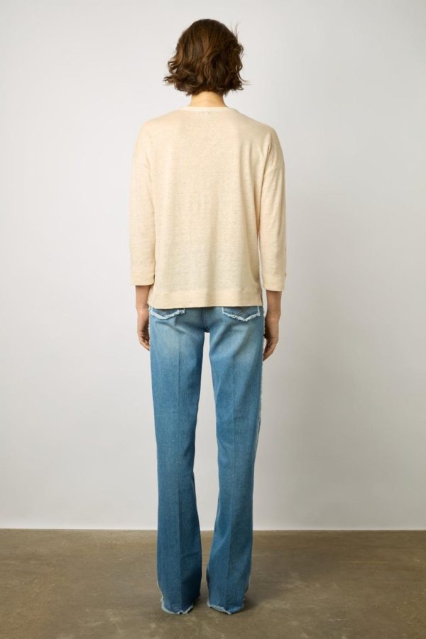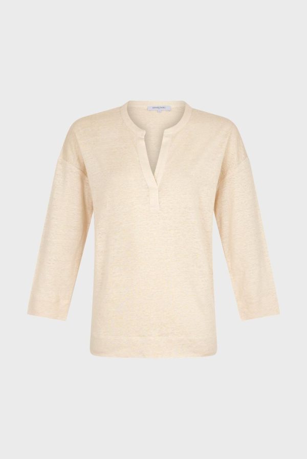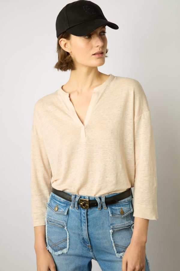 T-shirt en 100% lin avec un col tunisien. Coloris sable pour un été en douceur.