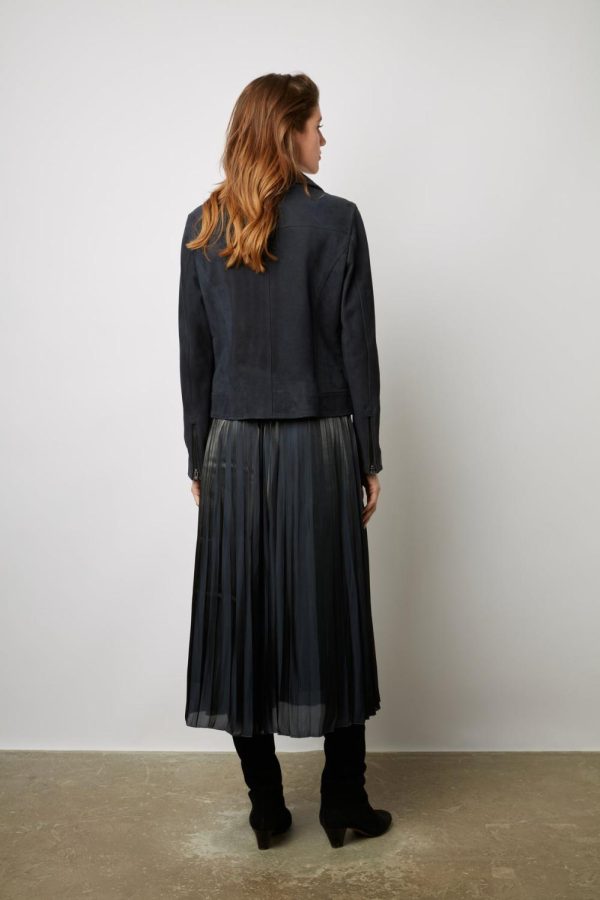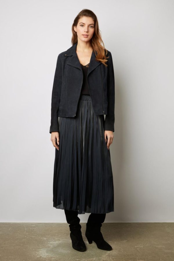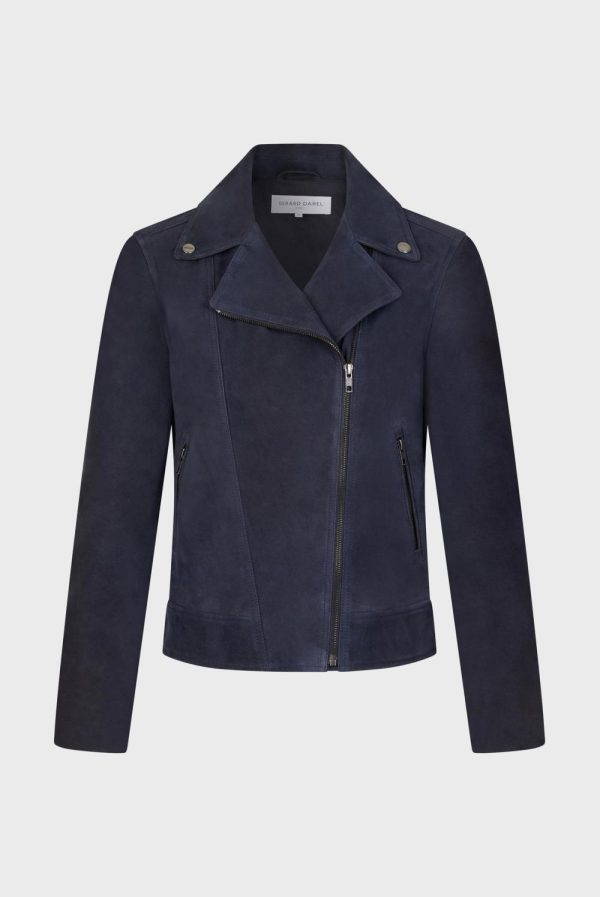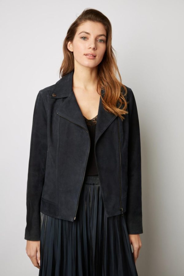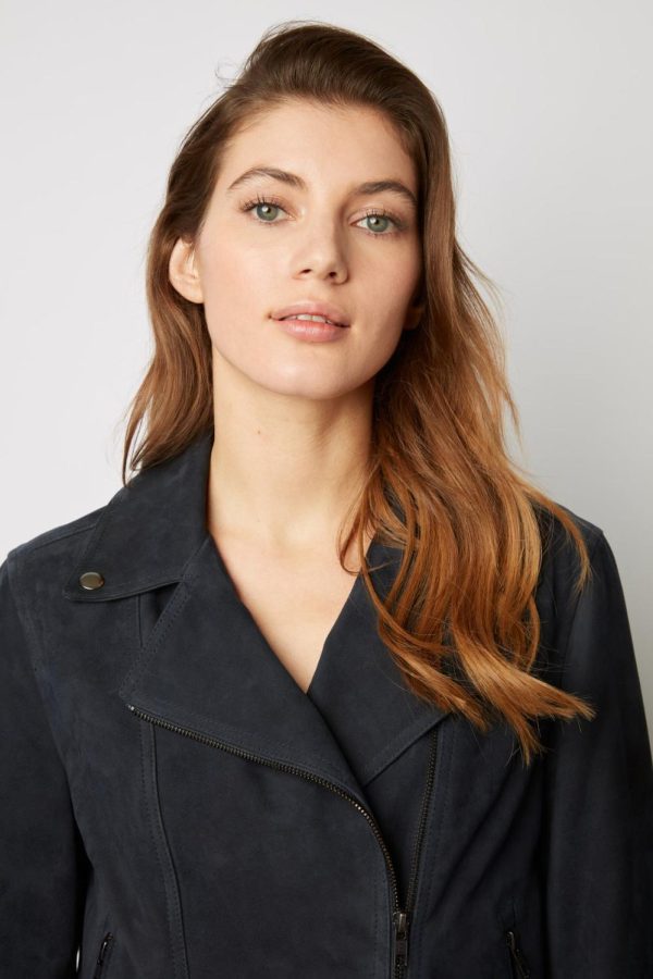 Veste biker dans un bleu marine profond pour un style rock chic. Cuir velours souple et doux.
