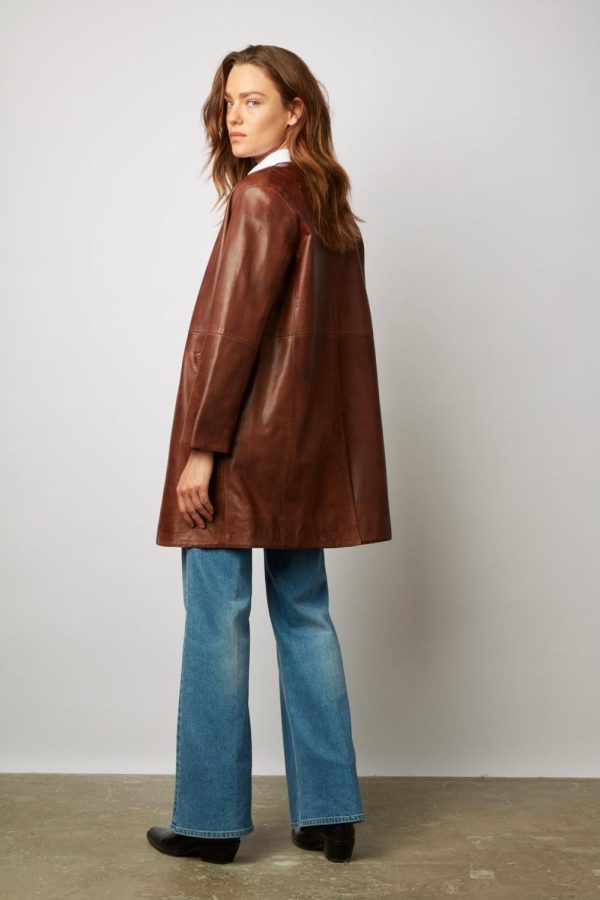 Manteau en cuir d’agneau lustré vieilli, dans un esprit minimal.